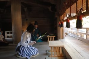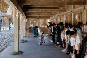 楼門に上がっての参拝という貴重な体験をする中で、子ども達なりに心を込めて祈りを捧げ神様との「結び」をつくろうとしていました。